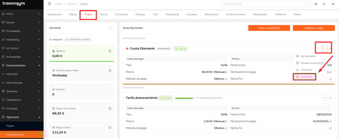 Puedes cancelar la suscripción de un socio desde la ficha del socio o desde payments-suscripciones. Además, podrás cancelar la suscripción inmediatamente o cancelar la renovación.