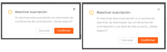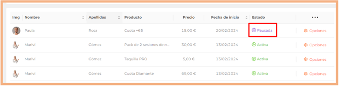 - Pausada. La suscripción se encuentra pausada en este momento. Si te posicionas sobre el estado, se mostrará el motivo de la suscripción.