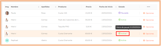 - Fecha de inicio. Será la fecha de inicio de la suscripción. Puede ser en el futuro si la introduces manualmente en el modal al registrar un pago. Orden ascendente o descendente.