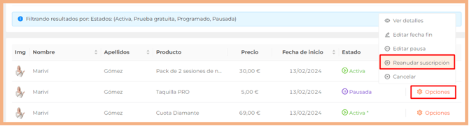 - Pulsa sobre ⚙️ Opciones en una suscripción Activa.