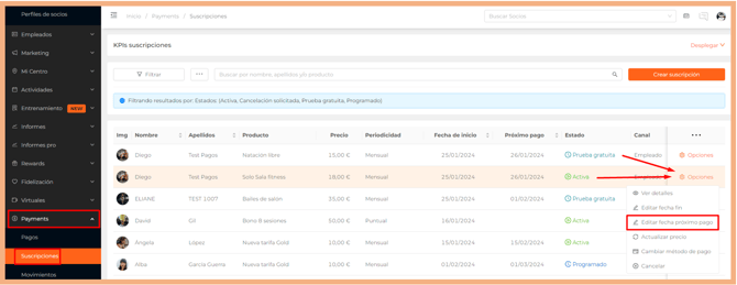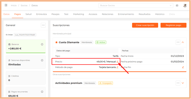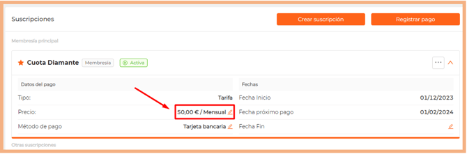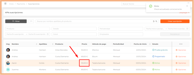 Puedes actualizar el precio de una suscripción desde la pestaña Pagos, dentro de la ficha del socio, o bien desde el listado de suscripciones.