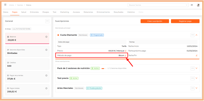 Al igual que con el precio, puedes cambiar el método de pago vinculado a una suscripción desde la pestaña Pagos en la ficha del socio o bien desde el apartado Payments > Suscripciones.