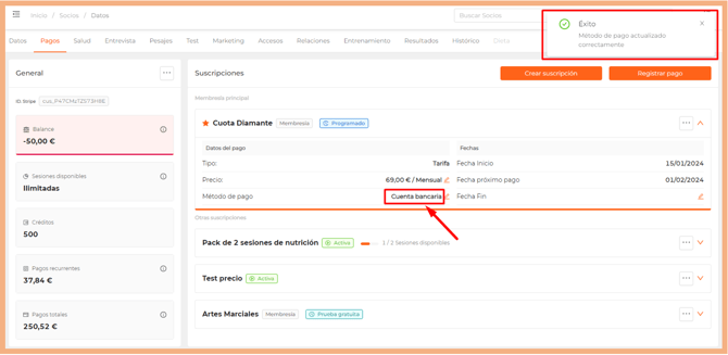 Cambiar método de pago desde la ficha del socio