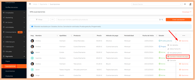 Cambiar el método de pago desde el listado de Suscripciones