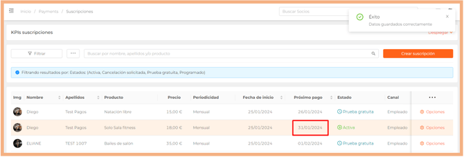 - Si se edita la fecha de pago en una suscripción antes de la primera fecha de pago (caso de suscripciones en estado prueba gratuita), el reset lleva implícito el cobro del importe total de la cuota. Ejemplo: