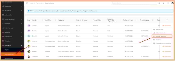 - Ajustar sesiones. Sólo para suscripciones con sesiones limitadas.