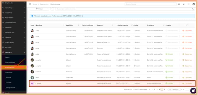 - Los movimientos se ordenan por la fecha de registro, que sería la fecha en la que se efectúa la reserva. En el caso de estos movimientos de ajuste de sesiones, dicha fecha figura en blanco, pues no se realiza ninguna reserva, por lo que aparecerán al final del listado.