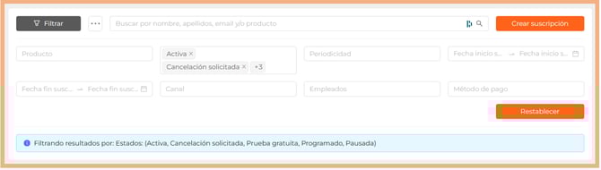 - Estado de la suscripción. Se mostrarán por defecto todas las suscripciones en estados Activa, Cancelada, Cancelación solicitada, Prueba gratuita, Impagado, Programado, Pausada y Vencida
