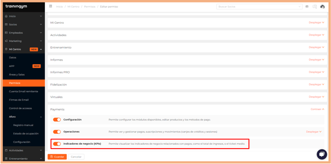 - Desplázate hasta el apartado "Payments" dentro de permisos.
