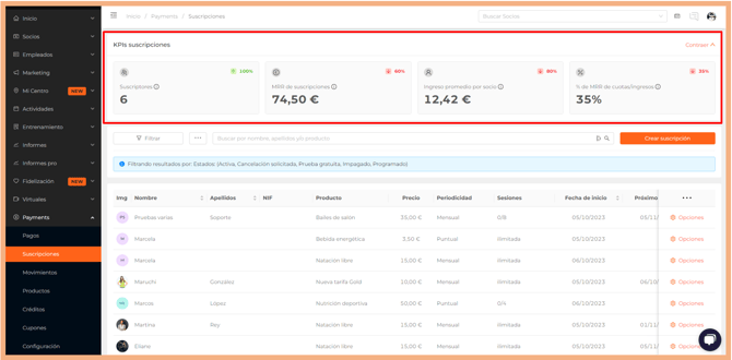 En la parte superior del submenú de Payments, "Suscripciones" podrás encontrar una serie de indicadores de negocio.