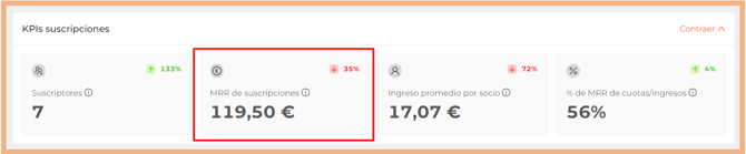 El MRR de suscripciones muestra el sumatorio de pagos vinculados a suscripciones (de cualquier tipo) cuya fecha de valor se encuentra en el mes natural de consulta del panel de KPIs.