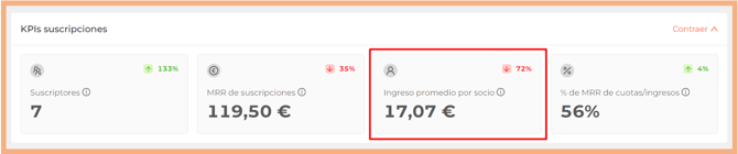 El ingreso promedio por socio es la división entre el MRR de suscripciones y el nº suscriptores.