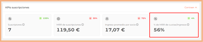 El %MRR suscripciones del total de ingresos es la división entre el MRR de suscripciones (Tarifas y bonos de cualquier tipo) e ingreso total (también contempla productos y pack de créditos). No se diferencian los tipos de suscripción. Si un socio tiene varias suscripciones, todo suma al numerador.