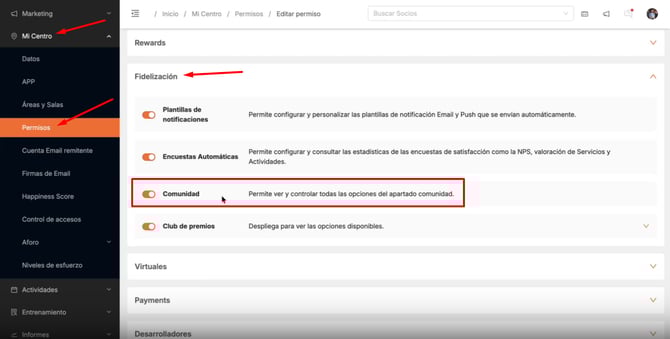 En Trainingym Manager, activa el permiso de Comunidad dentro de Mi Centro-Permisos-Fidelización-Comunidad.