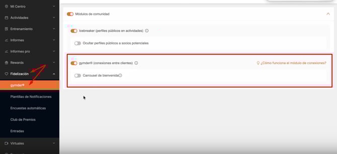 Una vez activo, accede al área de Fidelización-gymder y activa Gymder.