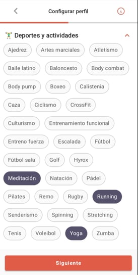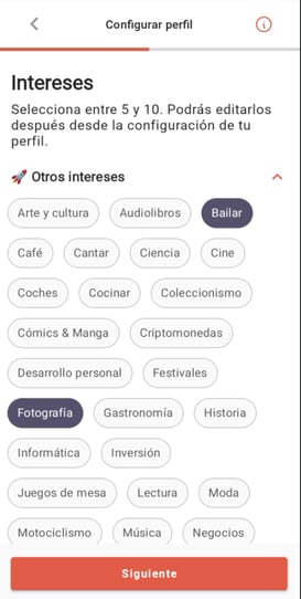 Seleccionar intereses : podrás seleccionar entre 5 y 10 intereses. Se dividen en otros intereses y deportes y actividades.