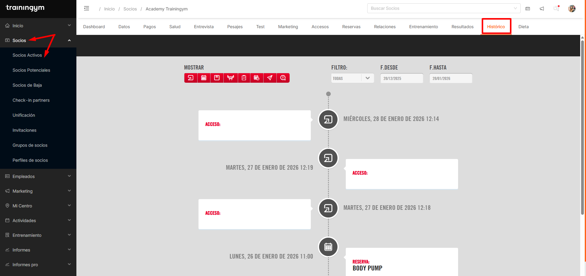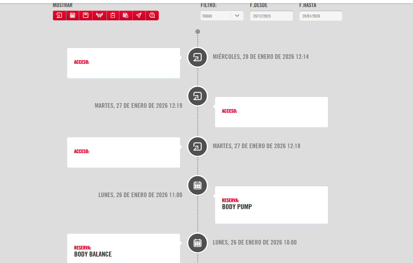 A través de la pestaña HISTÓRICO podemos consultar un registro actualizado en tiempo real de la interacción del socio con los servicios del centro.