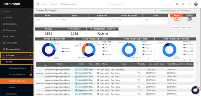 Para acceder a este informe, debes navegar por el menú Informes y seleccionar la opción Socios, seguida de Grupos de socios en Trainingym Manager.