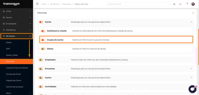 Si no logras localizar el informe siguiendo la ruta indicada (Informes > Socios > Grupos de socios), te recomendamos que revises tus permisos de empleado accediendo al menú Mi Centro > Permisos y actives la opción correspondiente.