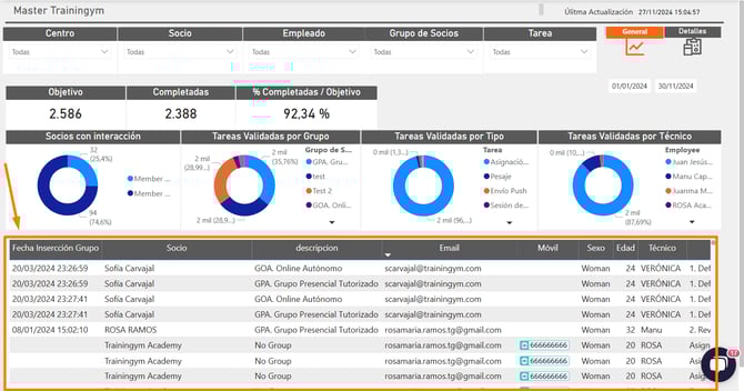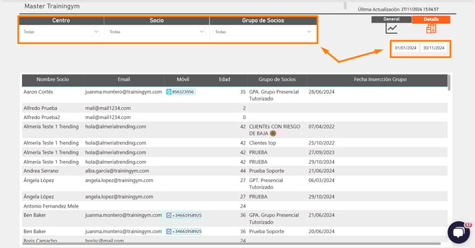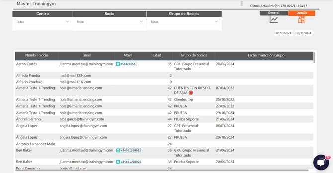 Este informe ofrece una visión exhaustiva de los socios, incluyendo sus datos de contacto, la clasificación por grupos y la fecha de inserción. Constituye una herramienta esencial para fundamentar decisiones estratégicas relacionadas con la retención, la gestión de riesgos y la personalización de los servicios que se brindan.