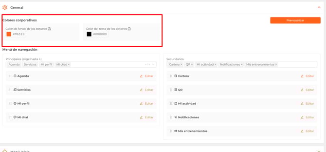 Las secciones Apariencia APP, Menú Inicio y Menú Chat no son editables, así como el resto de apartados sombreados que no han sido mencionados.