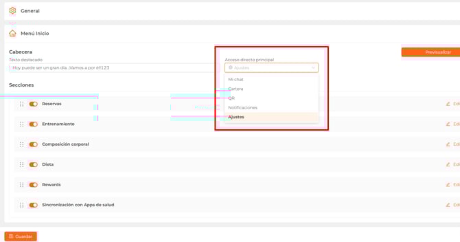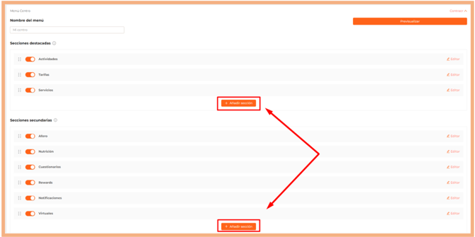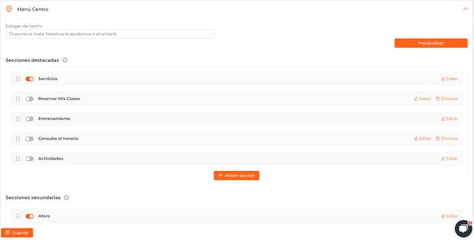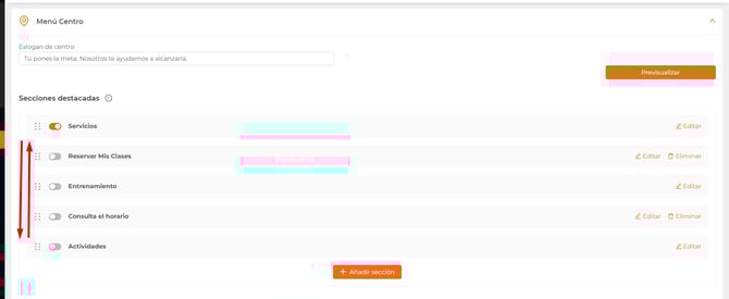 En el menú Centro podrás controlar la visibilidad de las secciones que tu centro tenga contratadas, ordenarlas a tu gusto, editar el nombre de cada una de ellas y previsualizar cómo se verá en la app del cliente.