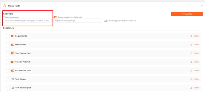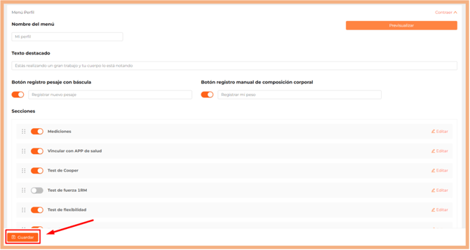 En el menú Perfil puedes configurar la visibilidad, nombre e imágenes de los apartados de seguimiento, mediciones y tests del cliente.