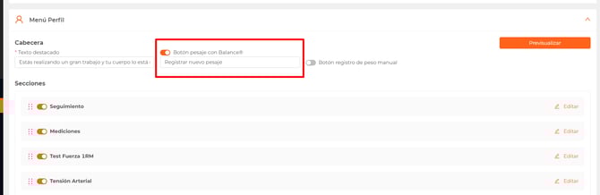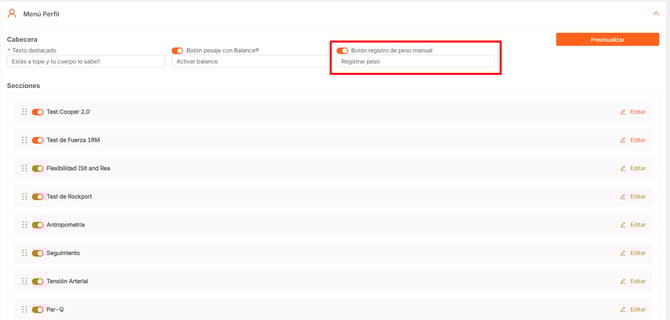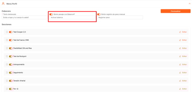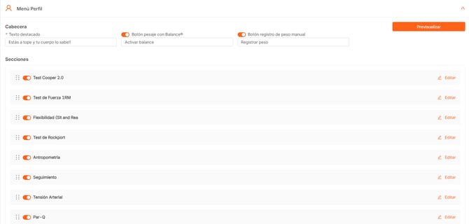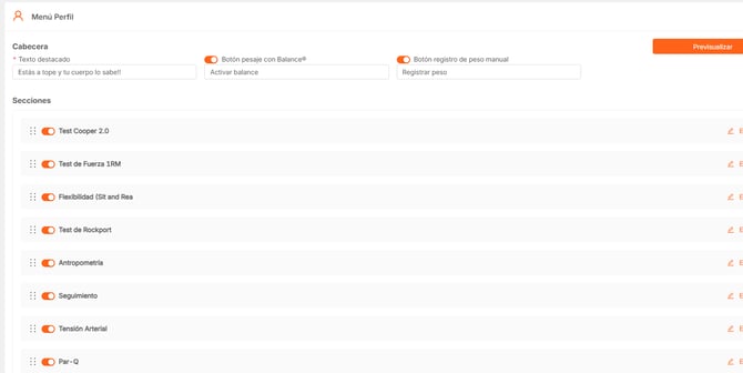 En el menú Perfil podrás controlar la visibilidad de los botones vinculados a pesajes y a los diferentes apartados de salud y tests, así como previsualizar cómo quedará en la app de tus clientes.