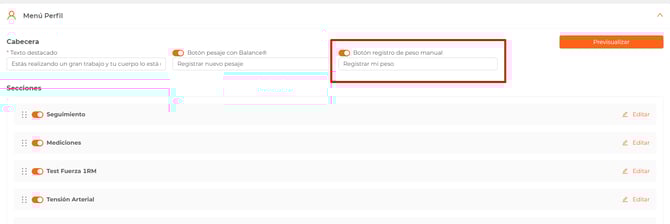 Además, al activarlo se mostrará el botón "Registrar mi peso" en el menú de Inicio y te permitirá controlar la visibilidad del mismo botón en el menú Mi Perfil.