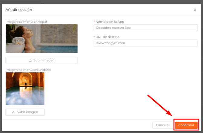 - Pulsa "Confirmar" cuando hayas terminado de crear tu sección para añadirla al menú y poder activar su visualización en la app.
