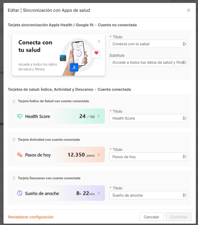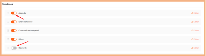 - Controla la visibilidad de las secciones de salud del cliente activando o desactivando el switch correspondiente a cada una de ellas.