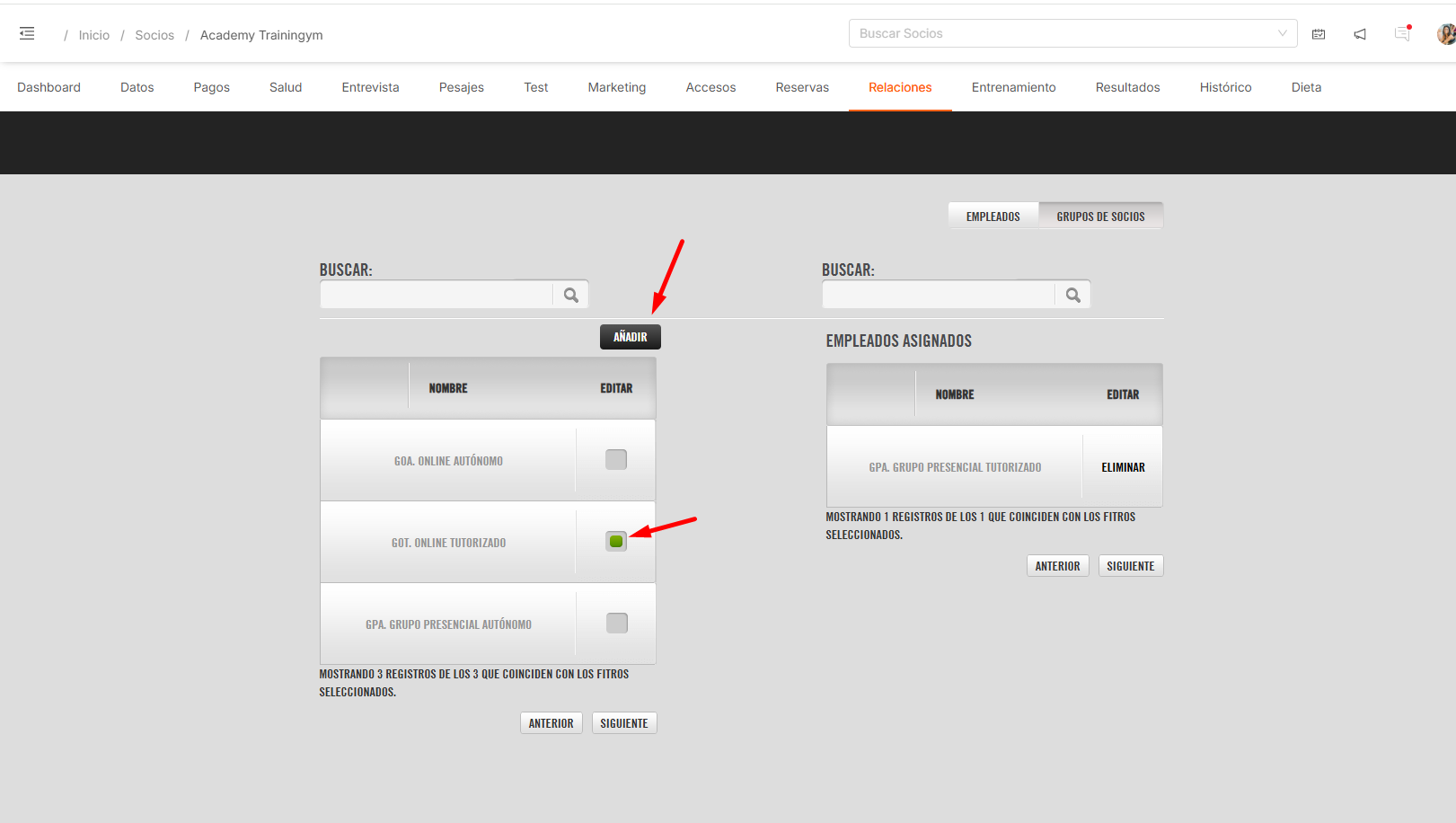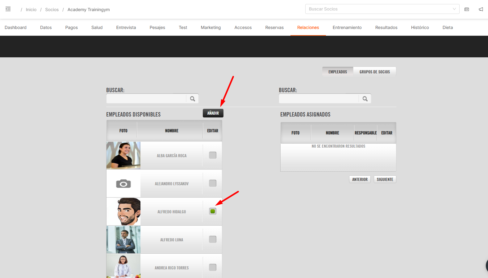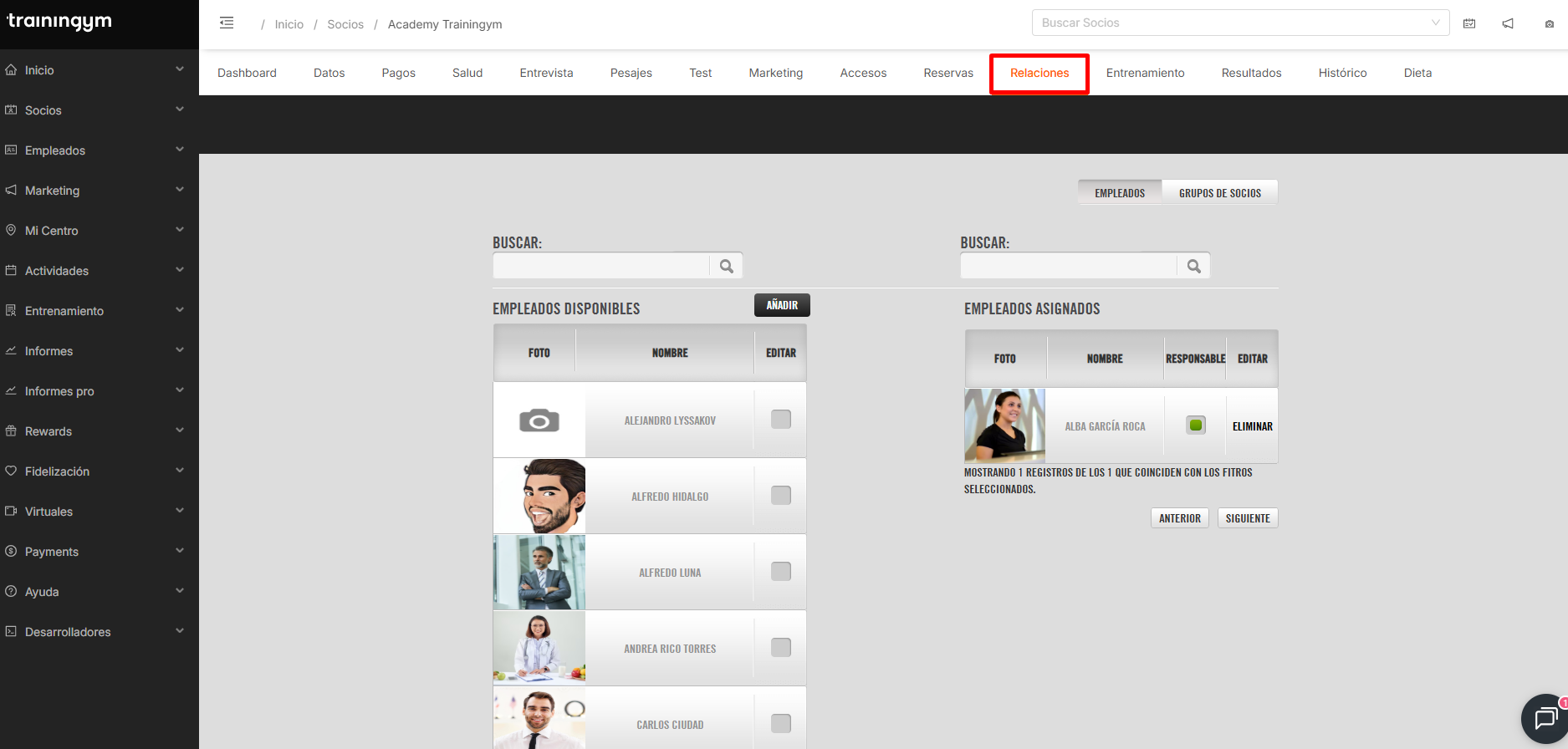 La relación Socio-Empleado describe la conexión entre el socio y el Staff de empleados. Trainingym ofrece varias alternativas para asignar esa relación socio-empleados, así como determinar el Empleado Responsable (el encargado de su seguimiento)