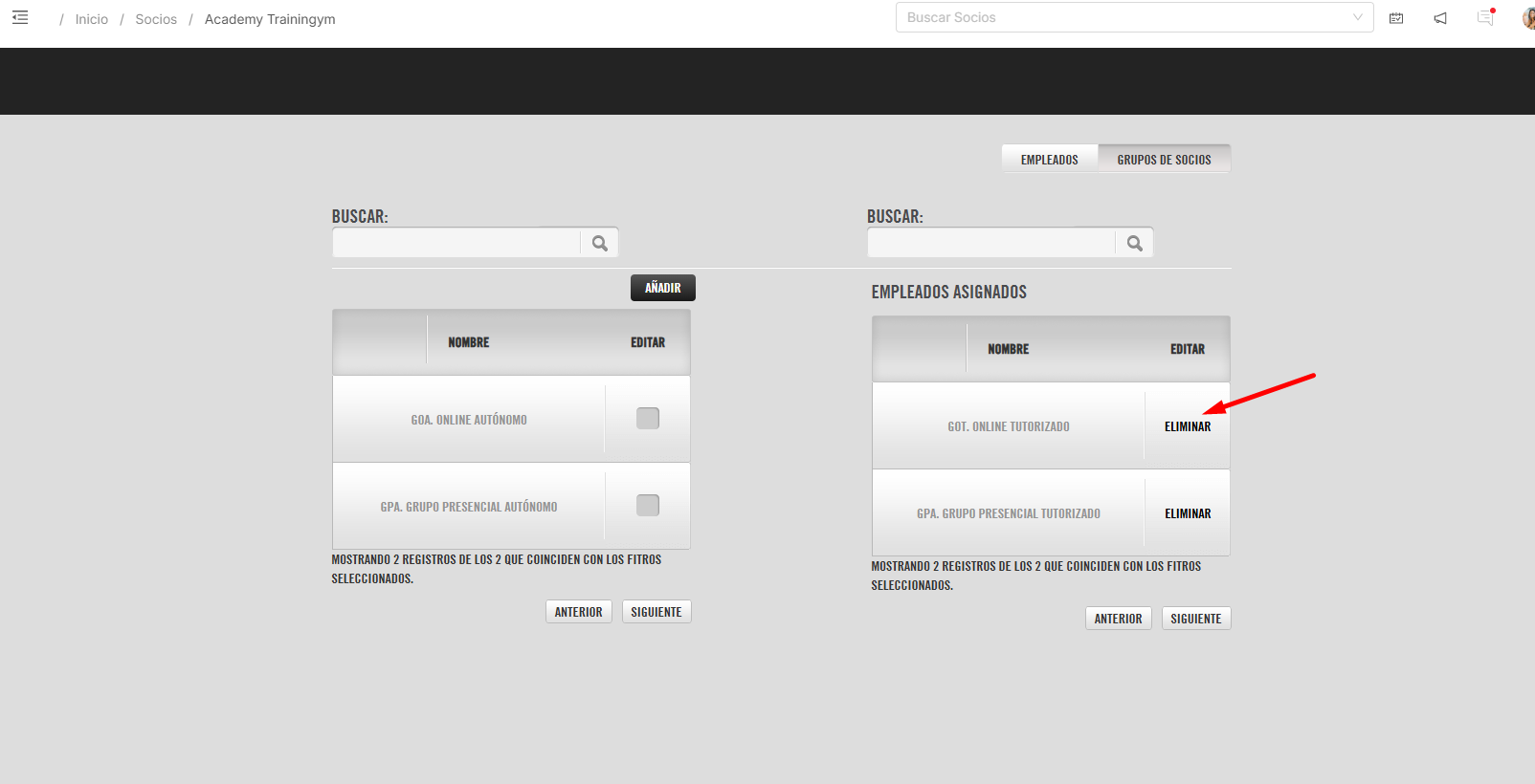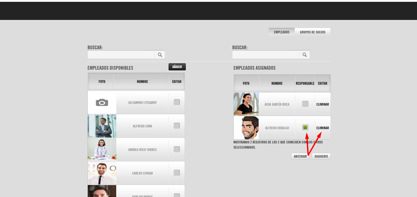 • EMPLEADOS ASIGNADOS: desde esta tabla podemos editar las relaciones asignadas del socio, modificando el empleado responsable, o eliminando la asignación de uno de los empleados