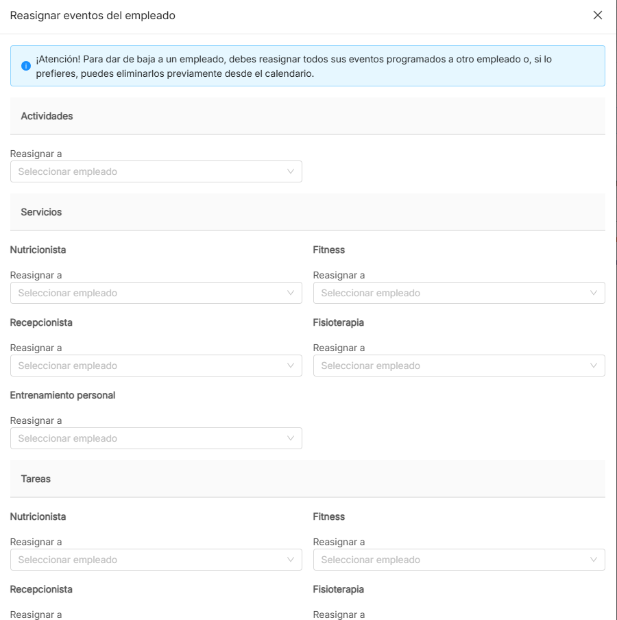 No hay problema, ya que al hacer clic sobre el icono de 🗑 Baja de empleado desde el listado de empleados, aparecerá una ventana emergente en el que se solicita seleccionar el empleado al que se le reasignarán las tareas, actividades y servicios de las categorías en las que esté incluido.