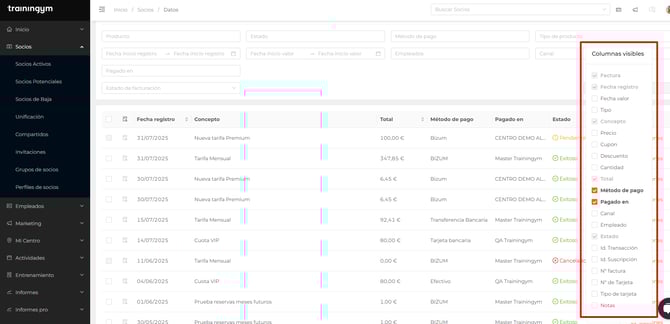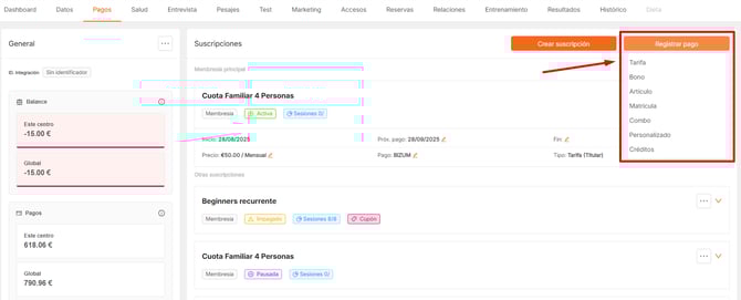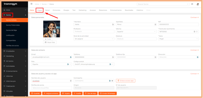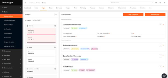 Controla todos los pagos, suscripciones, movimientos, métodos de pago... de los socios desde su ficha. Podrás ver toda la información financiera en una misma pestaña.