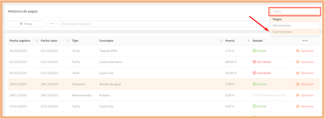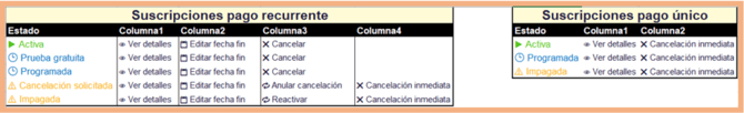 Dispondremos de las mismas opciones que en el menú Payments > Suscripciones. Dependiendo del tipo de suscripción y estado de la misma, las opciones serán las mostradas a continuación: