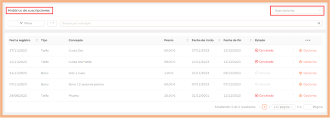 Las suscripciones en estados "Cancelada" y "Vencida" se podrán revisar en el histórico de suscripciones.