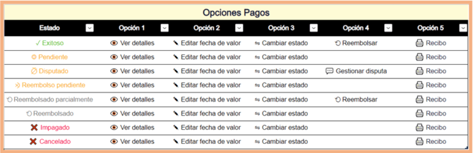 - Fecha de valor. Para los pagos en estado pendiente, impagado y cancelado esta fecha aparecerá en blanco.