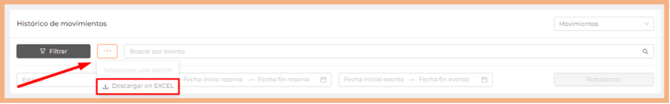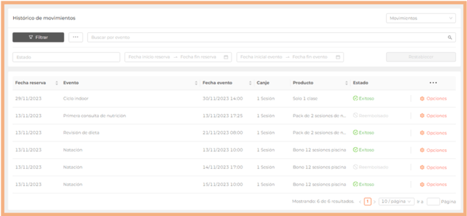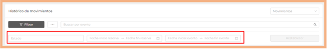 - El histórico de movimientos dispone de un buscador por evento o id Suscripción.