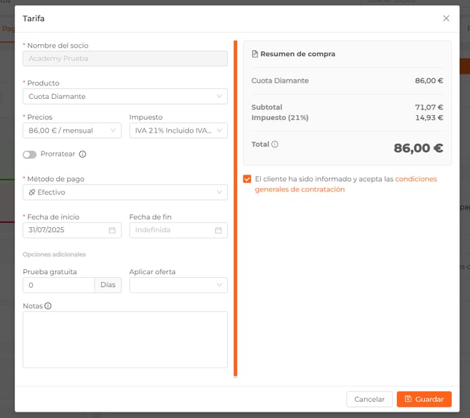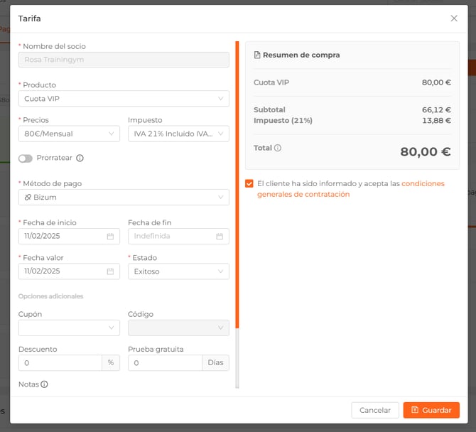 - Membresía principal: Aquí aparecerá la suscripción principal del cliente a una tarifa o bono. Esta tarifa o bono tendrá que tener el check "Membresía" activo.