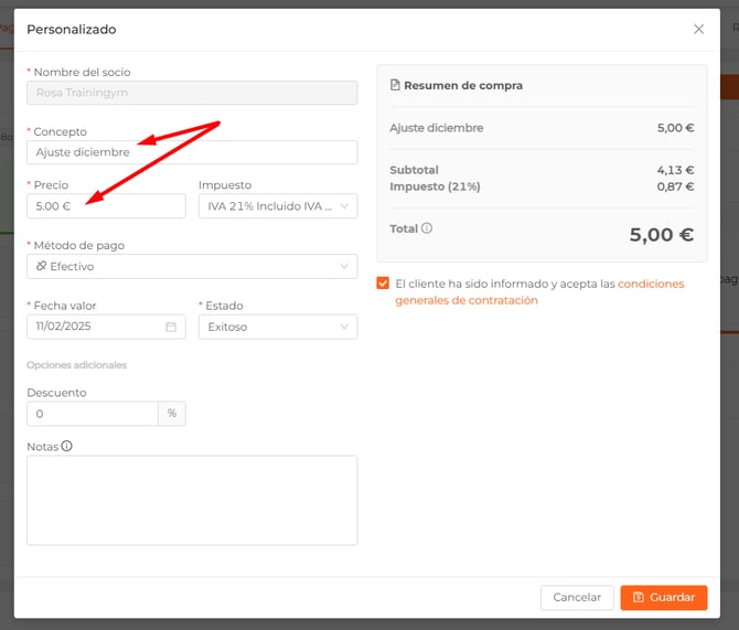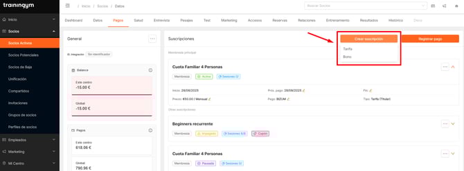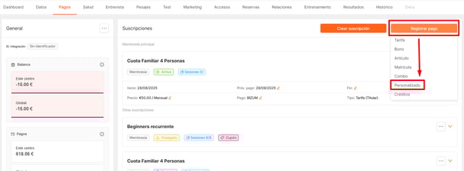 Los pagos personalizados no están asociados a ninguna tarifa, bono o producto. Son pagos customizados que te permiten ajustar el balance pendiente de un socio.