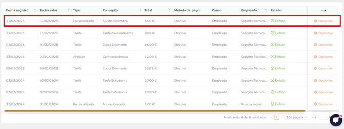 En el histórico verás: la fecha, ajuste, saldo Inicial antes del ajuste, saldo final después del ajuste, concepto asociado al movimiento, empleado y centro donde se realiza.