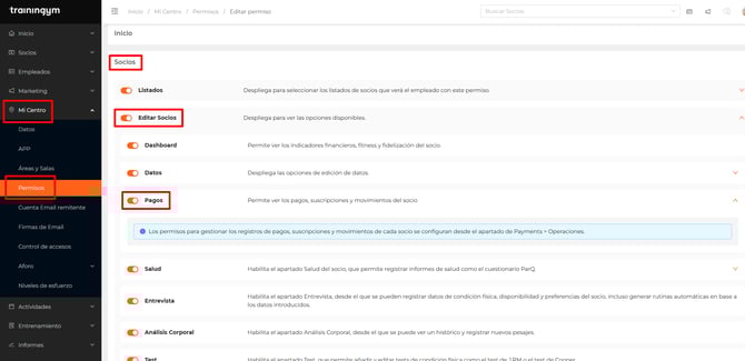 La visibilidad de la pestaña Pagos dentro de la ficha del socio se controlan mediante el permiso que encontrarás en Mi Centro > Permisos. Selecciona el permiso deseado y despliega el apartado Socios > Editar Socios > Pagos. Si lo activas esta pestaña quedará visible en la ficha del socio
