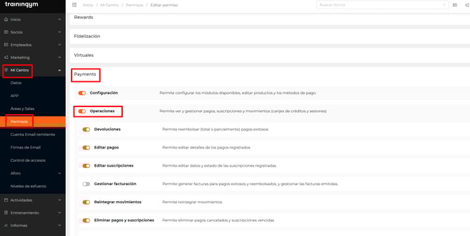 Como indica el mensaje, los permisos para gestionar los registros de pagos, suscripciones y movimientos de cada socio se configuran desde el apartado de Payments > Operaciones.