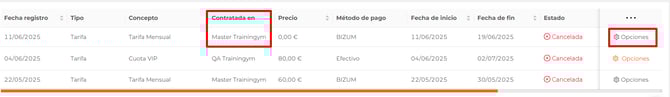 ℹ️ Si ves las Opciones deshabilitadas es porque la suscripción ha sido contratada en otro centro y solo podrás gestionarla desde dicho centro.