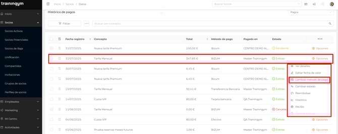Para poder editar el método de pago asociado a una transacción, dirígete a a la ficha del socio y, en las opciones del pago, clica sobre la opción "Cambiar método de pago".