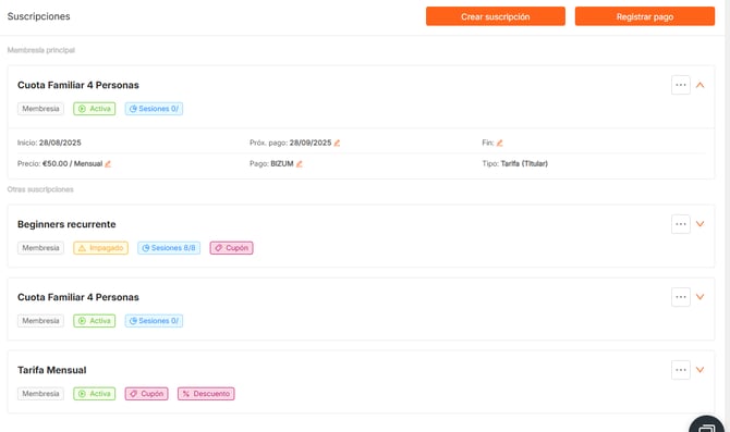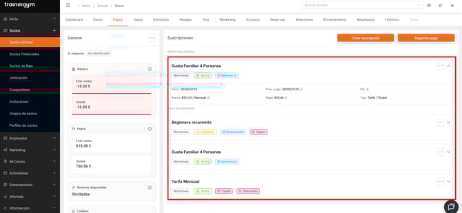 Desde el Panel financiero del socio podrás consultar y gestionar todas las suscripciones de un mismo cliente.