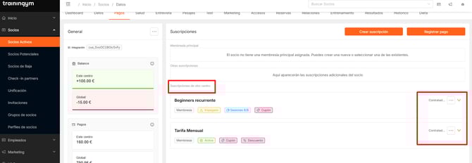 Además, en caso de que el socio sea multicentro, podrás ver las suscripciones que el centro tiene contratada en otros centros.