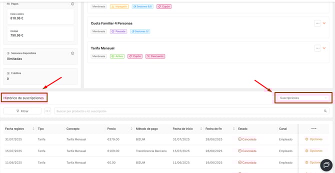 Desde el apartado "Suscripciones" podrás revisar las suscripciones activas de un cliente.