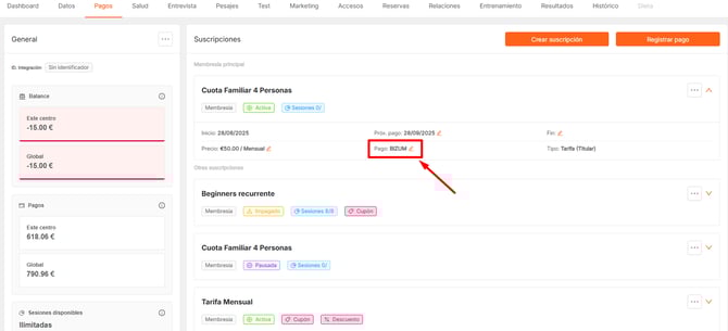 Consulta de un vistazo la situación de pago de tus clientes, sus sesiones disponibles, o su ciclo de facturación a través de la pestaña Pagos dentro de su ficha.